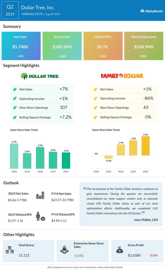 Dollar Tree estimates sales for the third quarter of 2019 to range from $5.66 billion to $5.77 billion, based on a low single-digit increase in same-store sales for the enterprise. Earnings per share are estimated to be in the range of $1.07 to $1.16. This estimate includes approximately $9 million, or $0.03 per diluted share, of discrete costs.