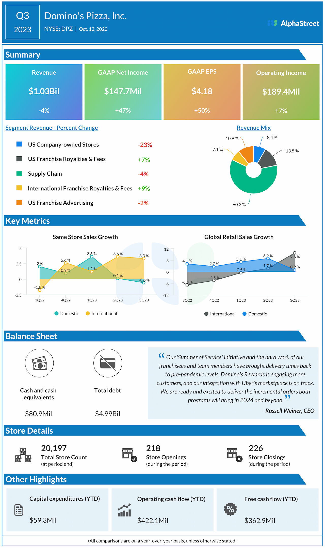 Fast food giant Domino’s Pizza, Inc. (NYSE: DPZ) is preparing to report fourth-quarter numbers next week, amid expectations for a positive outcome. The management is slightly cautious in its outlook for fiscal 2024, while efforts are on to increase volumes through various measures, ranging from competitive pricing to the adoption of generative AI.