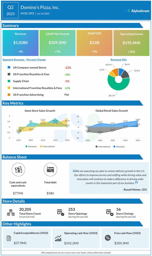 Right now, the key priorities for the world’s largest pizza chain include restoring delivery growth in the domestic market and driving order volumes by enhancing customer experience and through innovation. The company recently partnered with Uber Eats to serve delivery customers, whose number is growing steadily. Complementing the growth strategy, Domino’s opened an impressive 253 new stores in the second quarter and used around $38 million for capital spending in the first half.