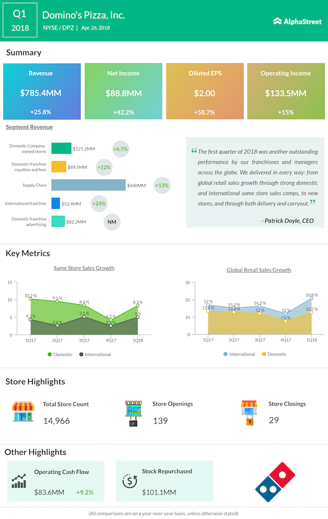 Domino’s Pizza Inc. (DPZ) reported a 25.8% growth in total revenues to $785 million for the first quarter of 2018. Revenues benefited from higher supply chain volumes resulting from order and store count growth.