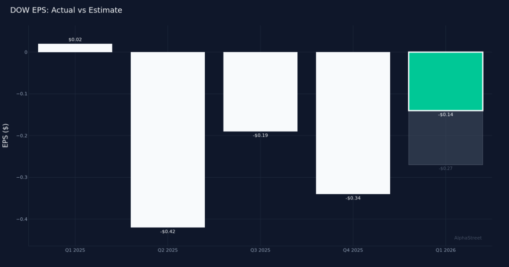 Better-than-feared results. Dow Inc. (NYSE:DOW) posted a Q1 2026 operating loss per share of $0.14, coming in 48.1% narrower than the $0.27 loss analysts ha...