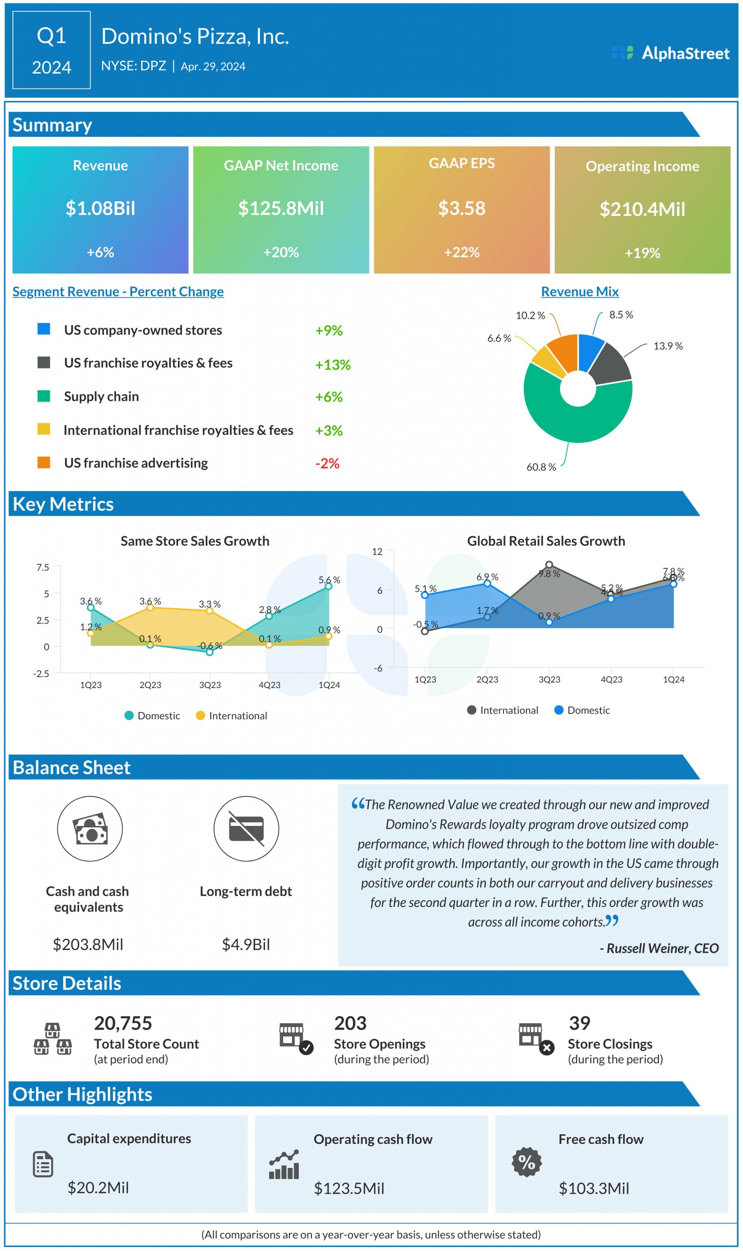 Domino’s Pizza, Inc. (NYSE: DPZ) reported first quarter 2024 earnings results today.