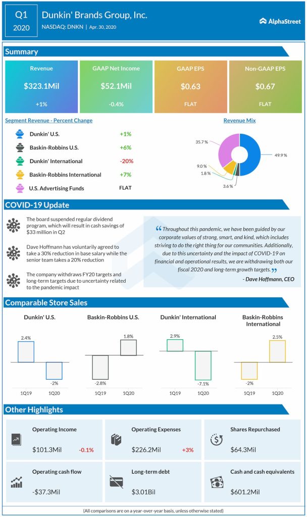Dunkin’ Brands Group, Inc. (NASDAQ: DNKN) reported its financial results for the quarter ended March 28, 2020, on Thursday before the bell. The top-line rose by 1.3% on an increase in sales of ice cream and other products as well as higher license fees related to Dunkin’ K-Cup pods and retail packaged coffee.