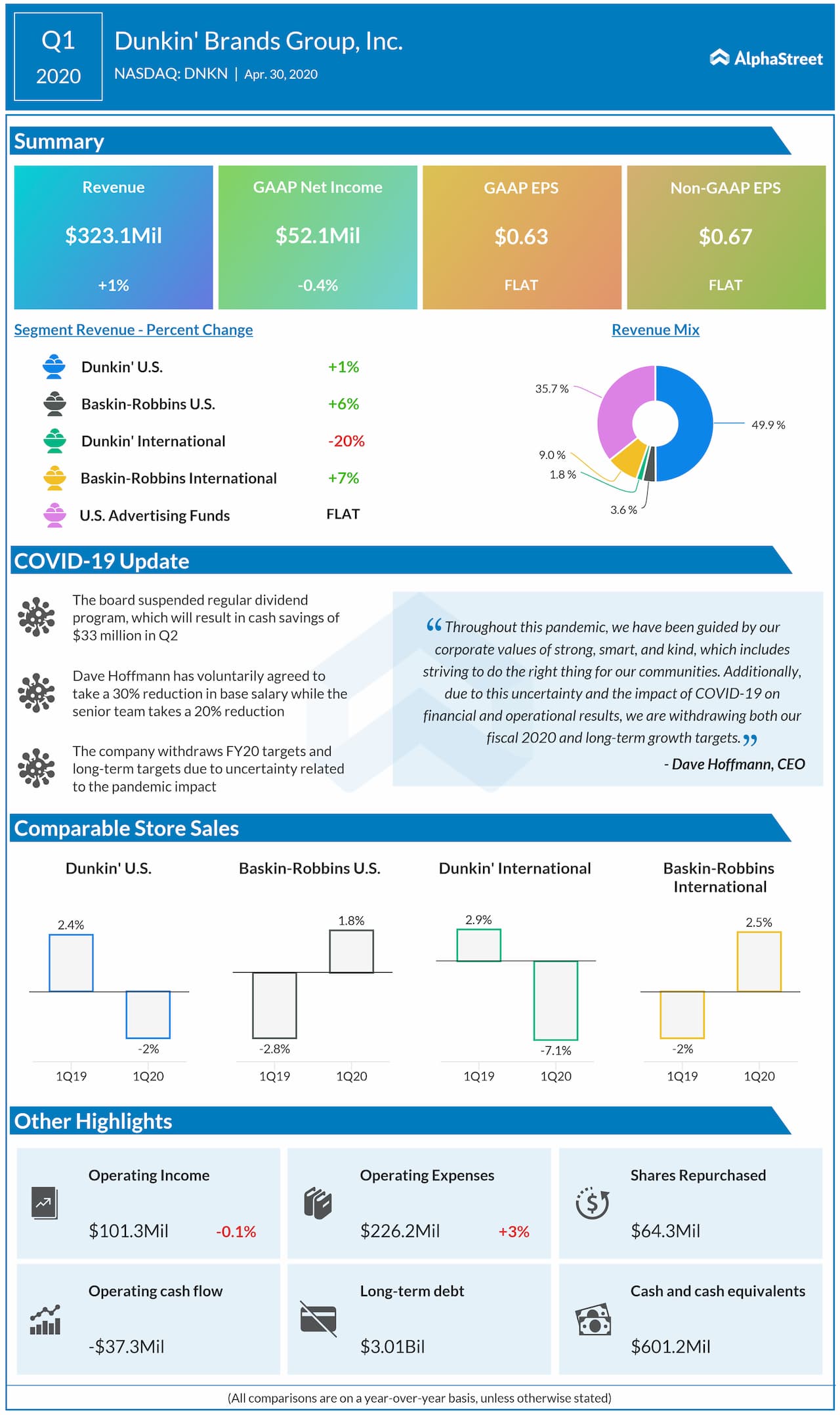 Global systemwide sales declined by 0.2% in the first quarter, primarily due to Dunkin’ global comparable store sales declines as a result of the global COVID-19 pandemic, partially offset by global store development and Baskin-Robbins comparable store sales growth. The pandemic had an unfavorable impact on systemwide sales for each of its segments.