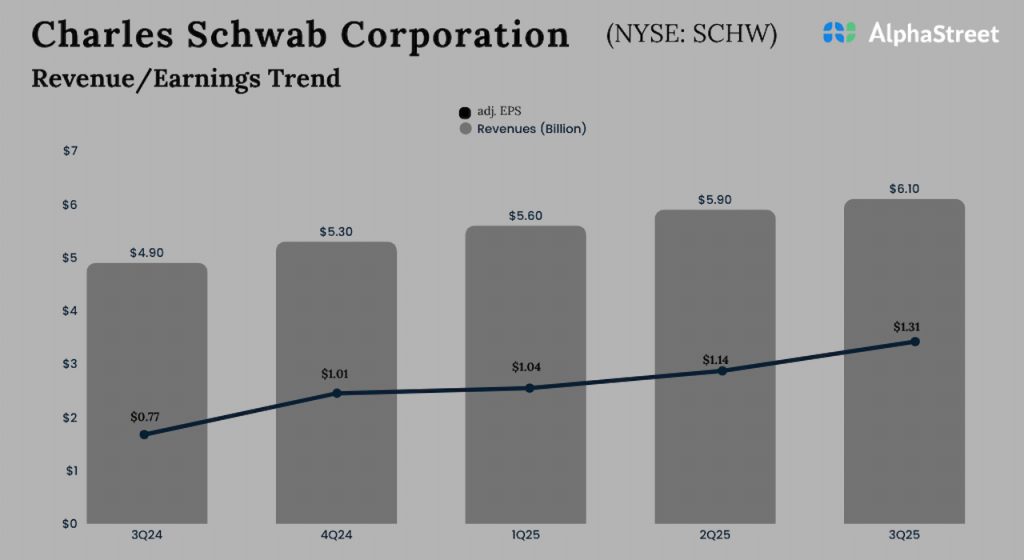 Financial services company The Charles Schwab Corporation (NYSE: SCHW) reported a sharp increase in revenues and adjusted earnings for the third quarter of fiscal 2025.