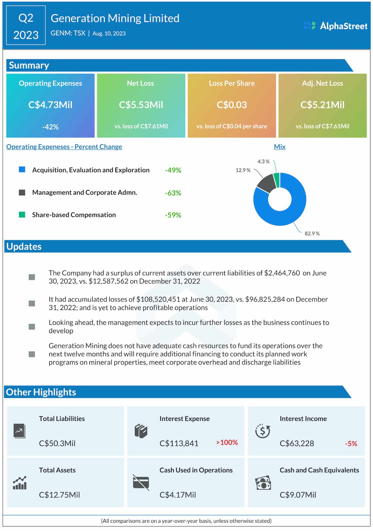 Generation Mining Limited (TSX: GENM) has announced financial results for the second quarter of 2023, reporting a narrower net loss amid a sharp fall in operating expenses.