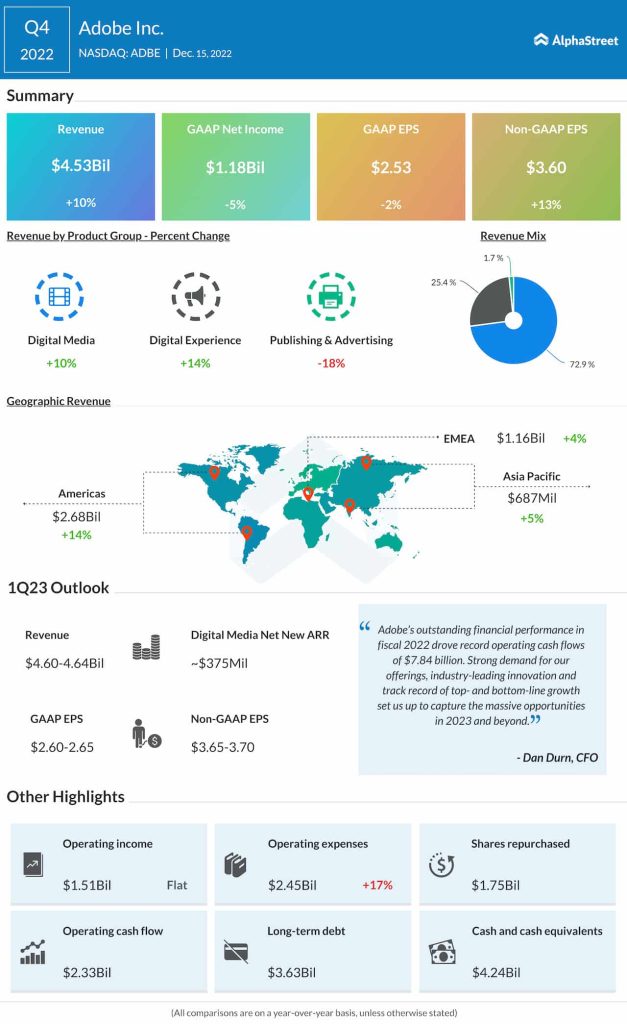 “Adobe drove record revenue and operating income in fiscal 2022. Our market opportunity, unparalleled innovation, operational rigor and exceptional talent position us well to drive our next decade of growth,” said Adobe’s CEO Shantanu Narayen.