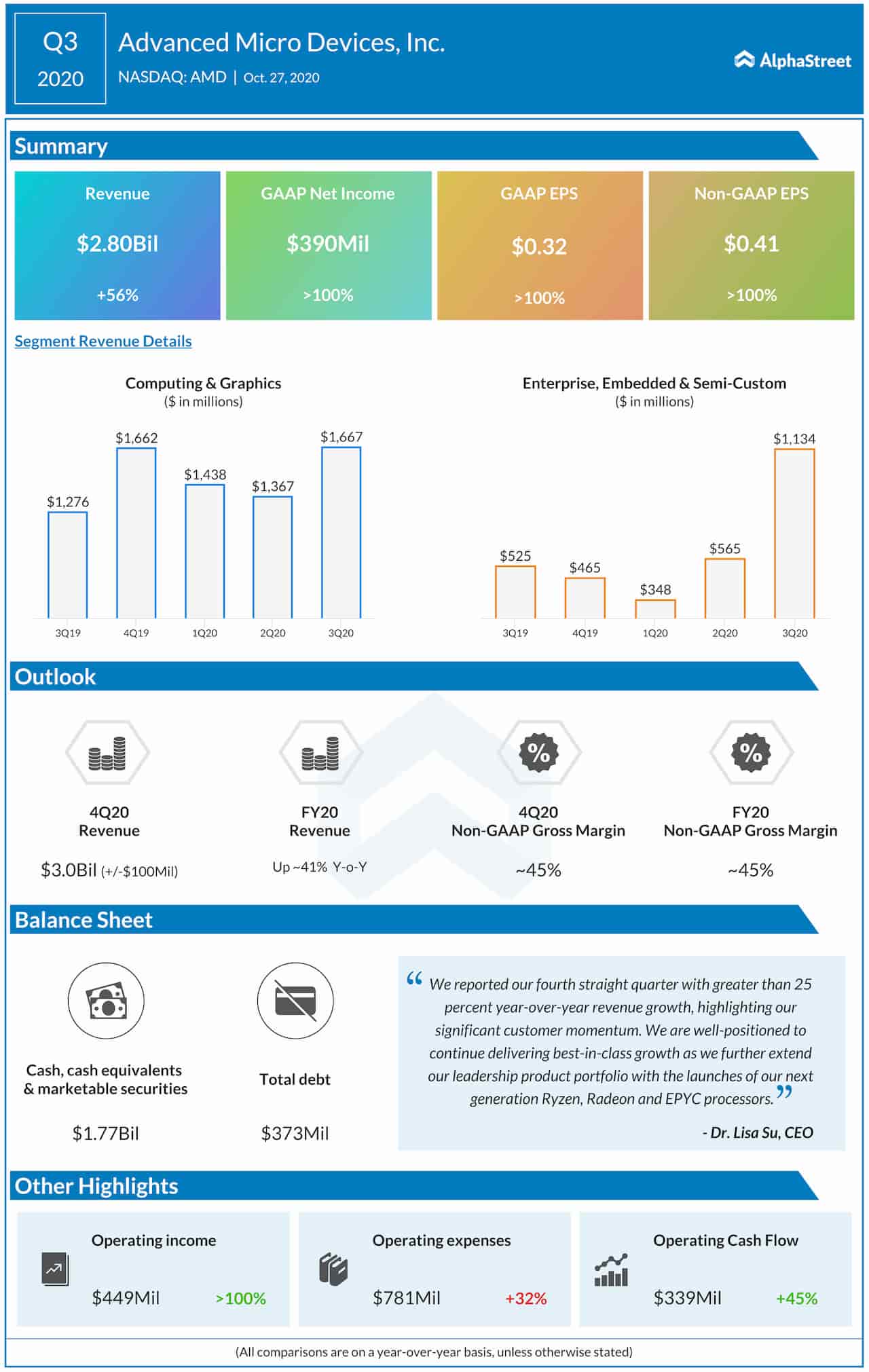 Semiconductor company Advanced Micro Devices, Inc. (NASDAQ: AMD) Tuesday said its third-quarter revenues grew 56% as demand conditions continued to improve. Consequently, earnings increased and surpassed the consensus estimate. Separately, the company announced the acquisition of rival chipmaker Xilinx (XLNX).