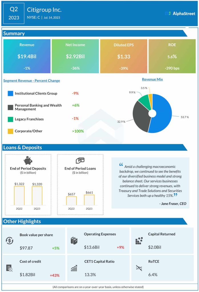 “Amid a challenging macroeconomic backdrop, we continued to see the benefits of our diversified business model and strong balance sheet,” said Citi’s CEO Jane Fraser.