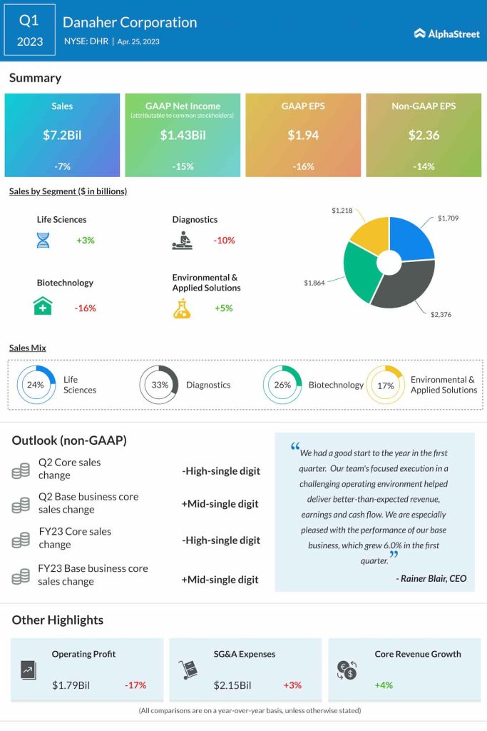 The bottom line was hurt by a 7% fall in net sales to $7.2 billion, mainly due to lower sales in the Diagnostics and Biotechnology segments.