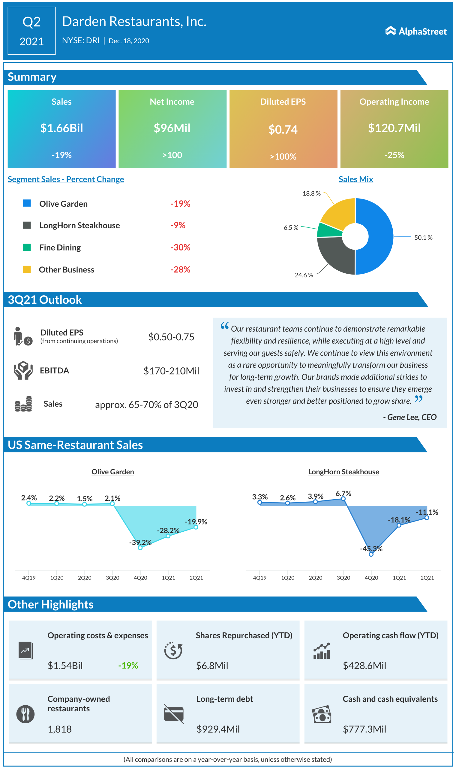 Darden Restaurants (NYSE: DRI) reported higher earnings for the second quarter of 2021, despite a decrease in sales amid historically low restaurant traffic due to the COVID-related restrictions.