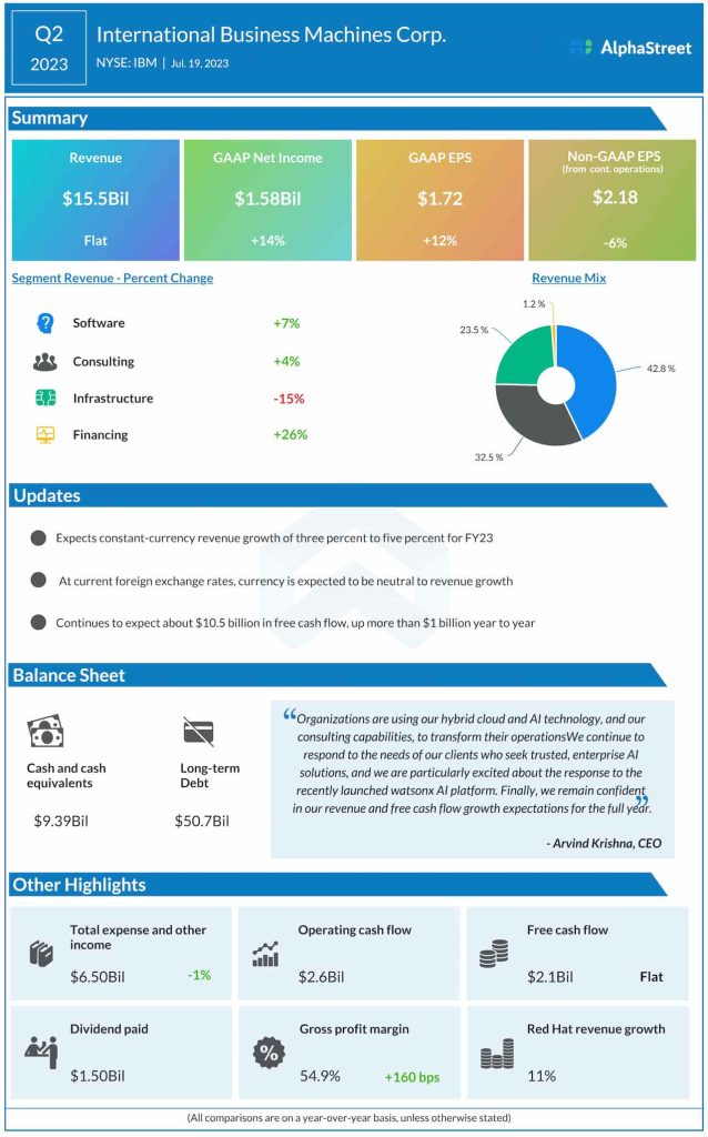 “We continue to respond to the needs of our clients who seek trusted, enterprise AI solutions, and we are particularly excited about the response to the recently launched watsonx AI platform. Finally, we remain confident in our revenue and free cash flow growth expectations for the full year,” said IBM’s CEO Arvind Krishna.