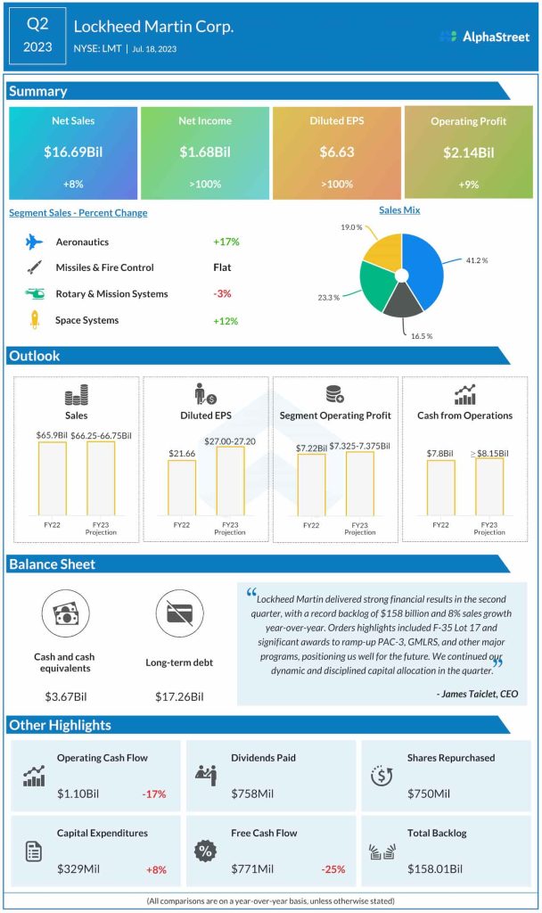 “Given the strength of our year-to-date results and ongoing demand for our signature programs and advanced technologies, we are raising our full-year sales and earnings per share outlooks for 2023,” said Lockheed Martin’s CEO Jim Taiclet.