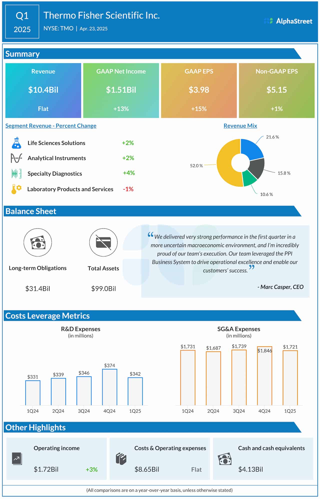 First-quarter revenue was $10.4 billion, which is broadly unchanged from the comparable quarter of 2024. Weakness in the core Laboratory Products & Services segment offset revenue growth in the other division.