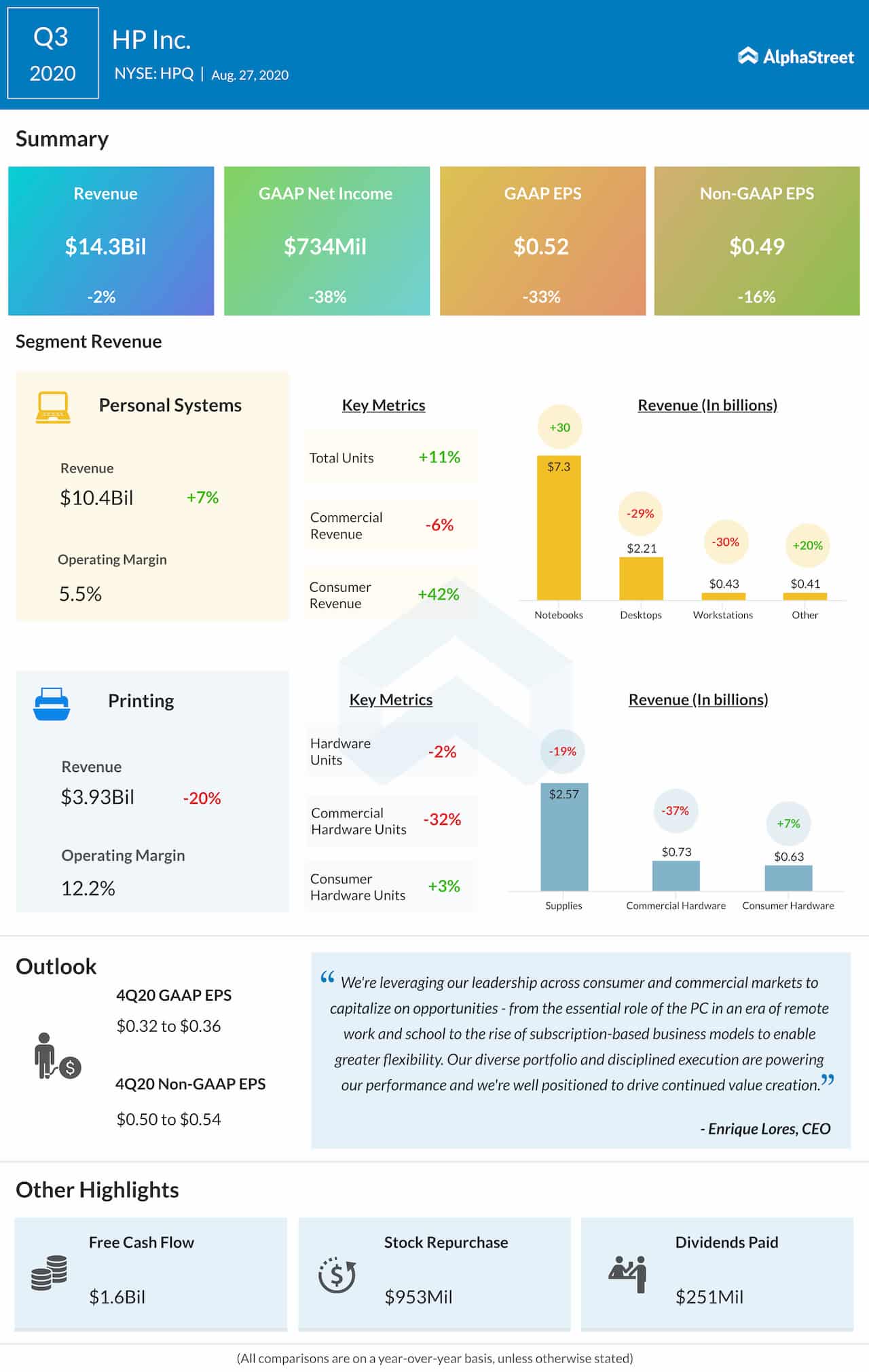 Shares of HP Inc. (NYSE: HPQ) gained on Thursday evening soon after the information technology firm reported financial results that topped expectations. However, third-quarter earnings and revenues decreased year-over-year, reflecting the COVID-driven slowdown.