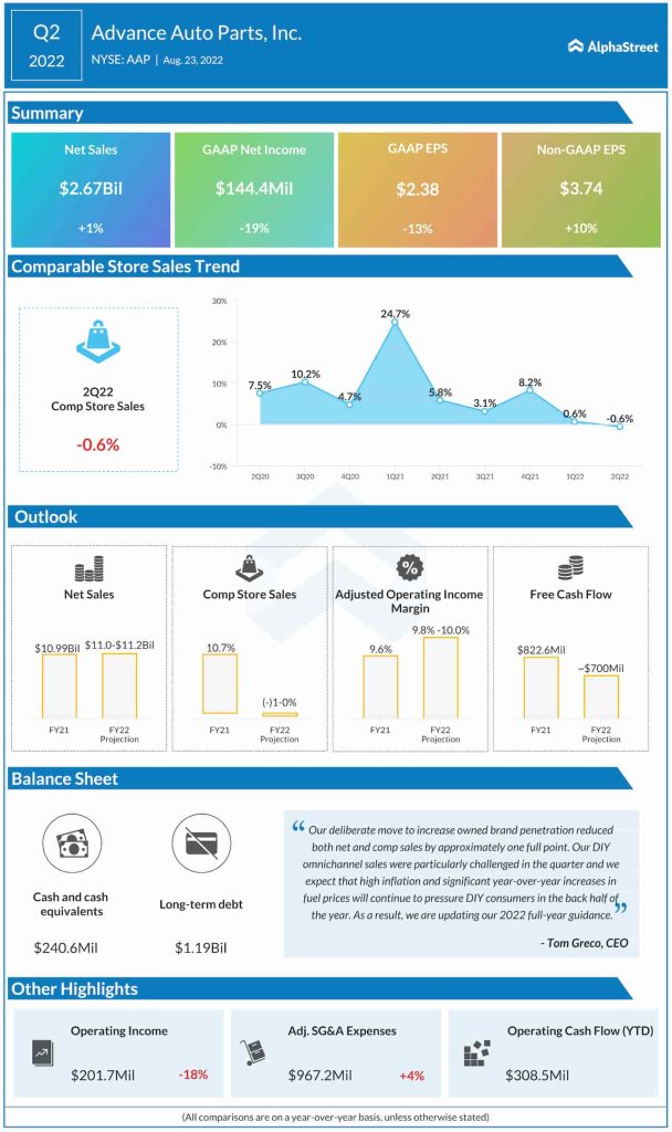 “Our adjusted operating income margin rate of 11.7% was the highest-level AAP has achieved in seven years. This helped enable a quarterly record for adjusted diluted earnings per share of $3.74, which increased 10.0% compared with Q2 2021 and 72% compared with Q2 2019. Additionally, we returned $291 million dollars to our shareholders through a combination of share repurchases and our quarterly cash dividend,” said Tom Greco, chief executive officer of Advance Auto Parts.