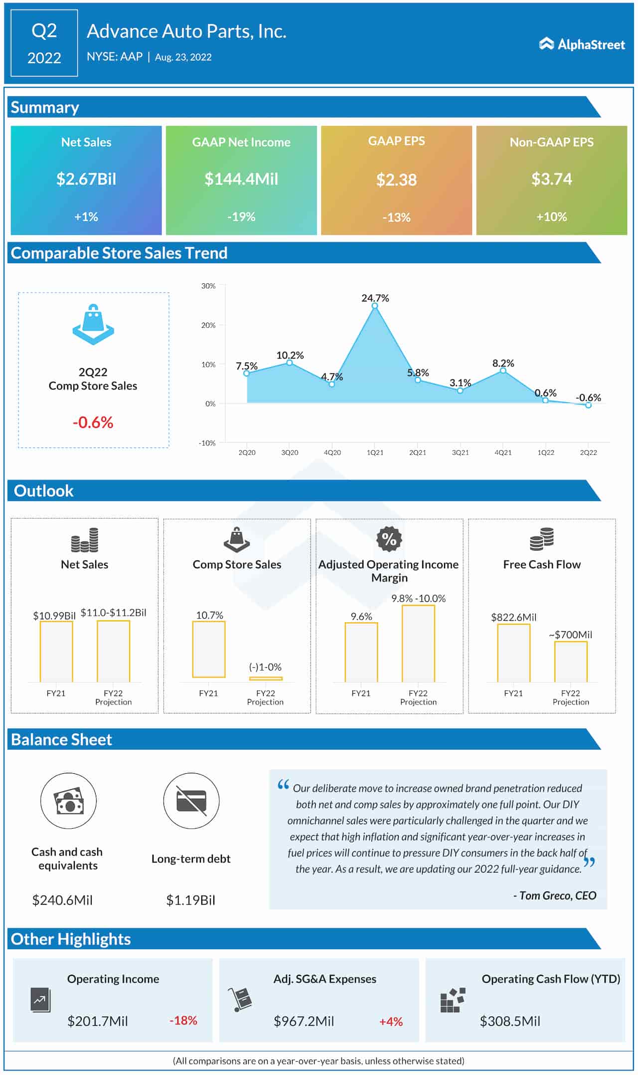 Advance Auto Parts, Inc. (NYSE: AAP) has reported financial results for the second quarter of fiscal 2022. Adjusted earnings increased 10% year-over-year amid modest revenue growth.