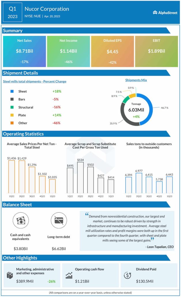 “Average steel mill utilization rates and profit margins were both up in the first quarter compared to the fourth quarter, with sheet and plate mills seeing some of the largest gains. This, coupled with year-over-year gains in automotive and stability in energy, gives us confidence that 2023 will be another very profitable year for Nucor,” said the company’s CEO Leon Topalian.