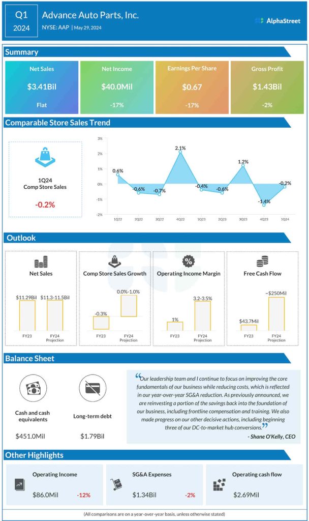 In the first three months of fiscal 2024, the company reported a 17% fall in net income to $40 million or $0.67 per share. Net sales remained broadly unchanged at $3.41 billion during the three months. Comparable store sales edged down 0.2% in Q1, which marked an improvement from the prior quarter when same-store sales dropped 1.4% year-over-year.