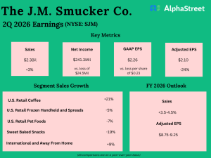 SJM expects adjusted earnings per share for Q3 2026 to decline a mid-teen percent. Analysts are predicting EPS of $2.26, which implies a 13% decline from the previous year. In Q2 2026, adjusted EPS decreased 24% YoY to $2.10.
