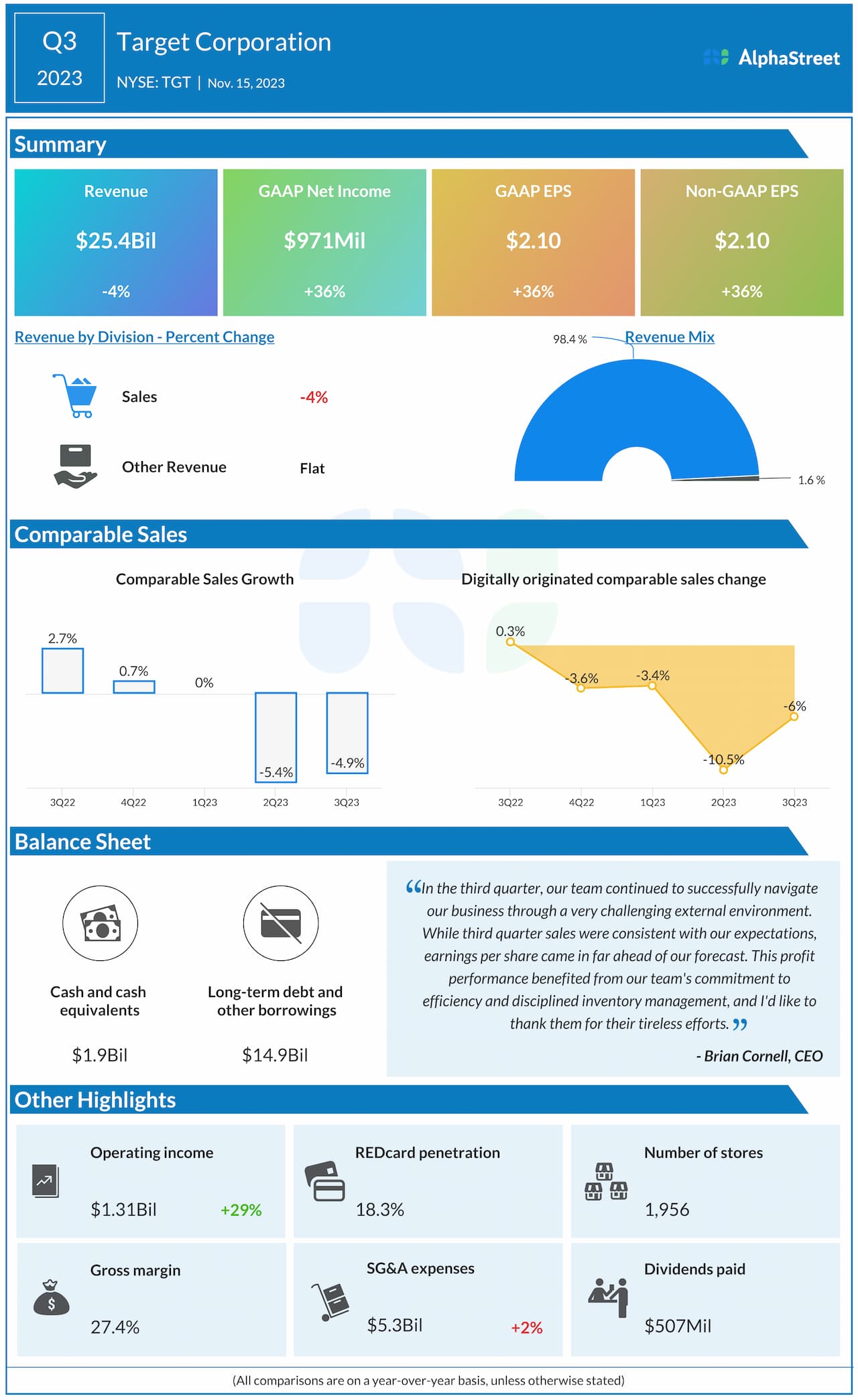 In the third quarter, earnings beat estimates for the fourth time in a row, after three consecutive misses. Q3 revenues declined 4% year-over-year to $25.4 billion but topped expectations. Comparable sales dropped 4.9% annually. At $2.10 per share, third-quarter adjusted earnings were up 36% from the year-ago quarter. Unadjusted profit also increased 36% annually to $971 million.