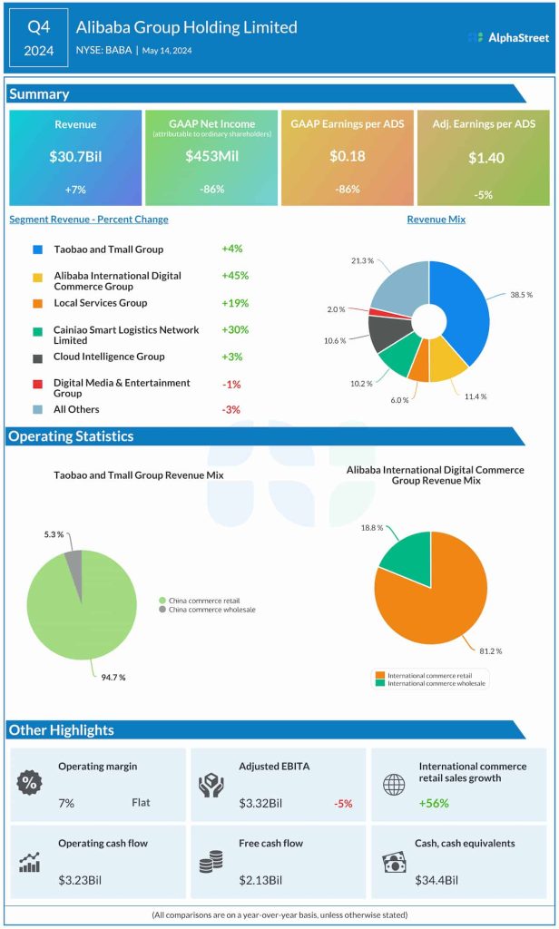 In the final three months of fiscal 2024, Alibaba’s revenues increased 7% year-on-year to $30.7 billion, with key operating segments performing well. The Chinese and international commerce businesses generated double-digit growth in gross merchant volume during the quarter. Meanwhile, fourth-quarter adjusted earnings decreased 5% to $1.40 per ADS, continuing the recent trend. Unadjusted net income was $453 million or $0.18 per ADS, down 86% from the fourth quarter of 2023.