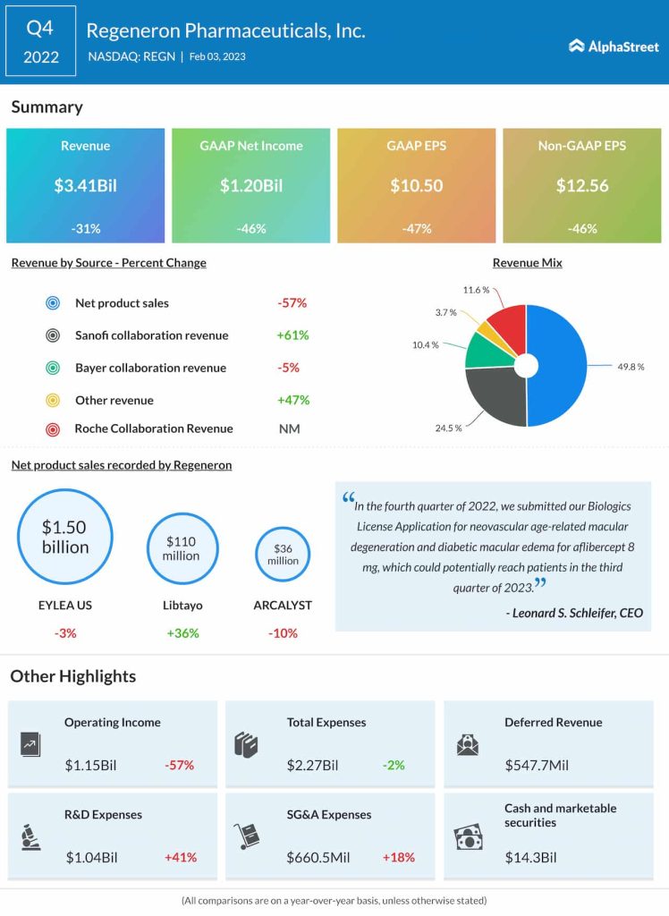 Total revenues plunged 31% year-over-year to $3.41 billion in the three months ended December 2022. Excluding REGEN-COV and Ronapreve, however, revenues increased by 14%.
