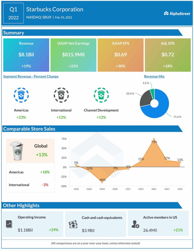 The Seattle, Washington-based coffeehouse said its first-quarter profit, on an adjusted basis, increased to $0.72 per share from $0.61 per share in the corresponding period of last year. However, the latest number came in below the market’s projection. Unadjusted net income moved up to $815.9 million or $0.69 per share from $622.2 million or $0.53 per share in the first quarter of 2021.