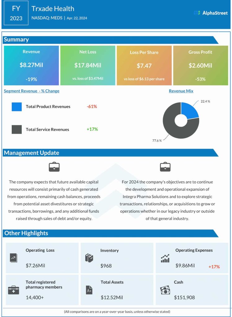 As a result, the net loss attributable to Trxade Health widened to $17.84 million in FY23 from $3.47 million in the twelve months ended December 2022.