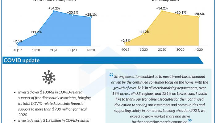 Lowe’s Companies, Inc. (NYSE: LOW) reported fourth-quarter 2020 earnings results today. Total sales rose to $20.3 billion from $16 billion in the same period