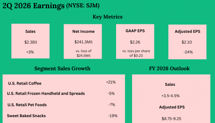 The J.M. Smucker Co. (NYSE: SJM) reported its second quarter 2026 earnings results today. Net sales was $2.3 billion, up 3% from the