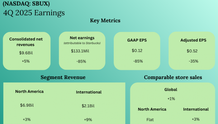 Starbucks Corporation (NASDAQ: SBUX) reported its fourth quarter 2025 earnings results today. Consolidated net revenues increased 5% year-over-year to $9.56 billion. Global