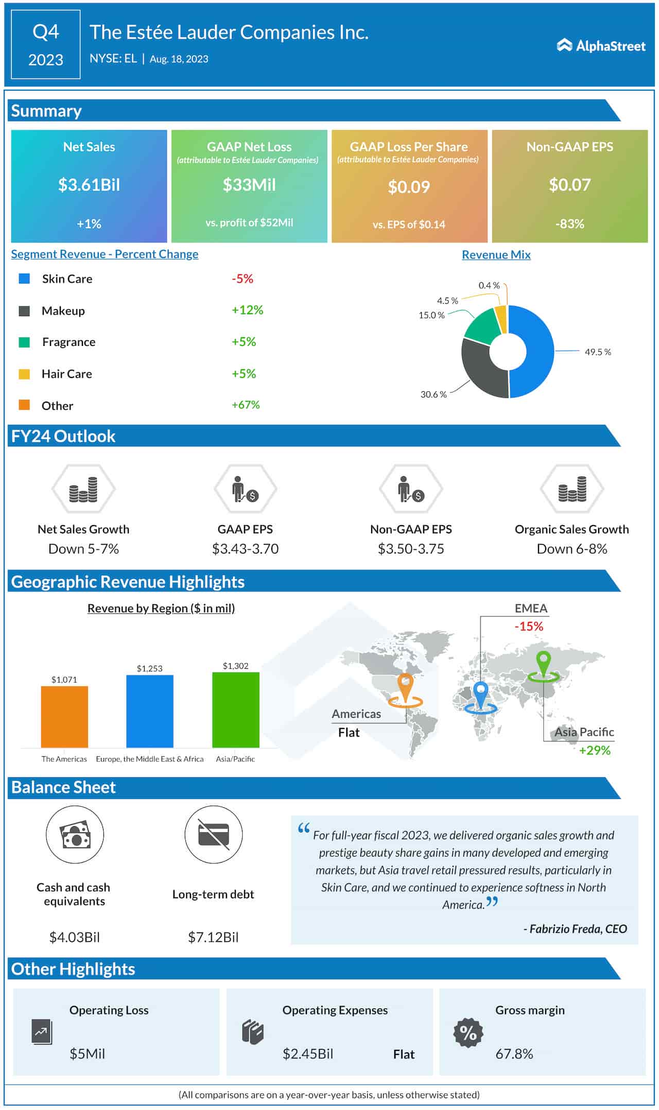 Estee Lauder Companies Inc. (NYSE: EL) announced financial results for the fourth quarter of 2023, reporting modest revenue growth and lower adjusted earnings.
