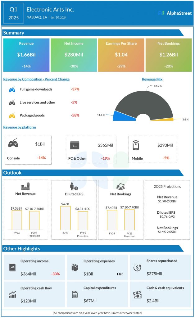 Electronic Arts (NASDAQ: EA) reported net revenue of $1.66 billion for the first quarter of 2025, down 14% from the same period a year ago.