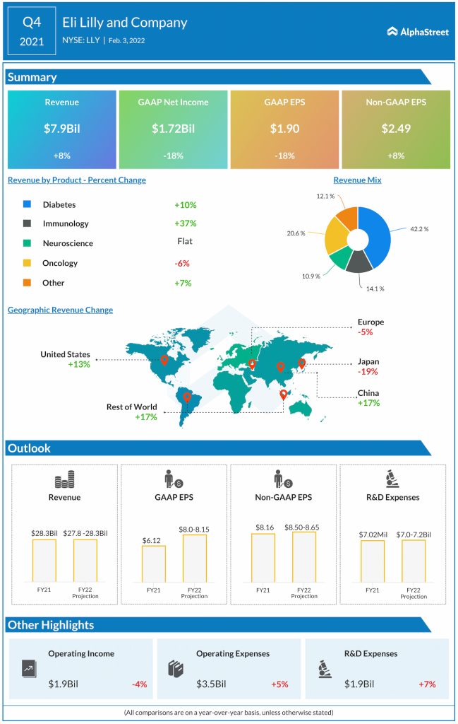 Eli Lilly and Company (NYSE: LLY) reported revenue of $7.9 billion for the fourth quarter of 2021, up 8% year-over-year.
