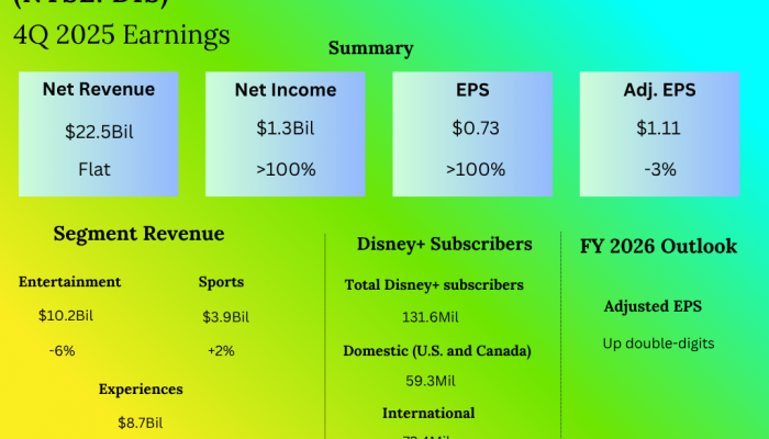 The Walt Disney Company (NYSE: DIS) reported its fourth quarter 2025 earnings results today. Revenues of $22.5 billion were comparable to the