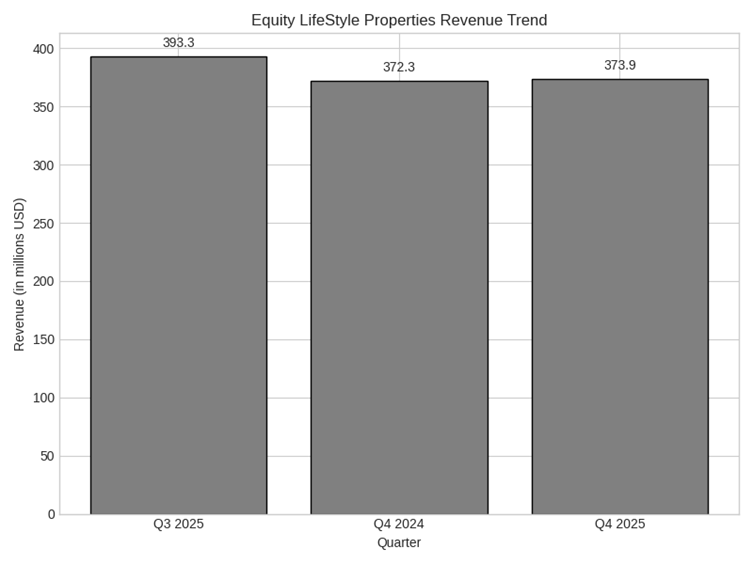 Equity LifeStyle said its normalized funds from operations (FFO) available to common stock and OP unit holders for the quarter ended December 31, 2025, rose to $0.78 per share from $0.76 per share a year earlier. This was generally in line with or slightly above some consensus estimates. Total revenue for the quarter increased to $373.87 million from $372.32 million in Q4 FY2024. Net income available to common stockholders for the quarter was $100.46 million, or $0.52 per share, compared with $95.98 million, or $0.50 per share, a year ago. Analysts had expected earnings of about $0.51 per share and revenue of roughly $382 million.