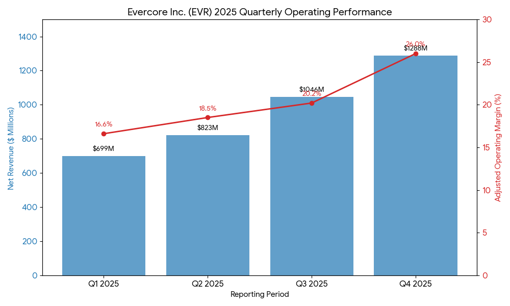 For the fourth quarter ended Dec. 31, 2025, Evercore reported net revenues of approximately $1.30 billion, an increase of about 32% year-over-year from roughly $980.5 million in Q4 2024. Adjusted revenues were on par with this figure.