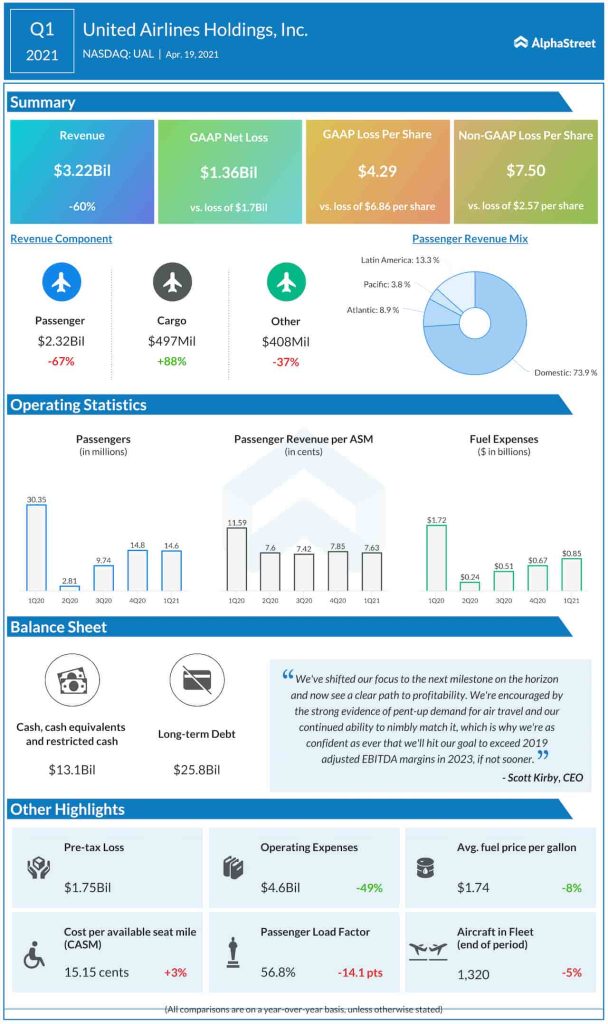 The airline incurred a loss of $7.50 per share in the first quarter, on an adjusted basis, which is wider than the $2.57-per share loss recorded last year. The reported loss was $1.36 billion or $4.29 per share, compared to a loss of $1.7 billion or $6.86 per share in the first quarter of 2020. The bottom line also missed the Street view.