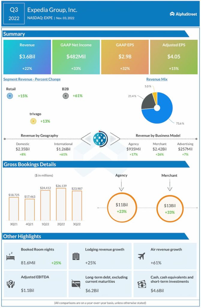 Expedia Group, Inc. (NASDAQ: EXPE) reported revenues of $3.6 billion for the third quarter of 2022, up 22% from the same period a year ago.