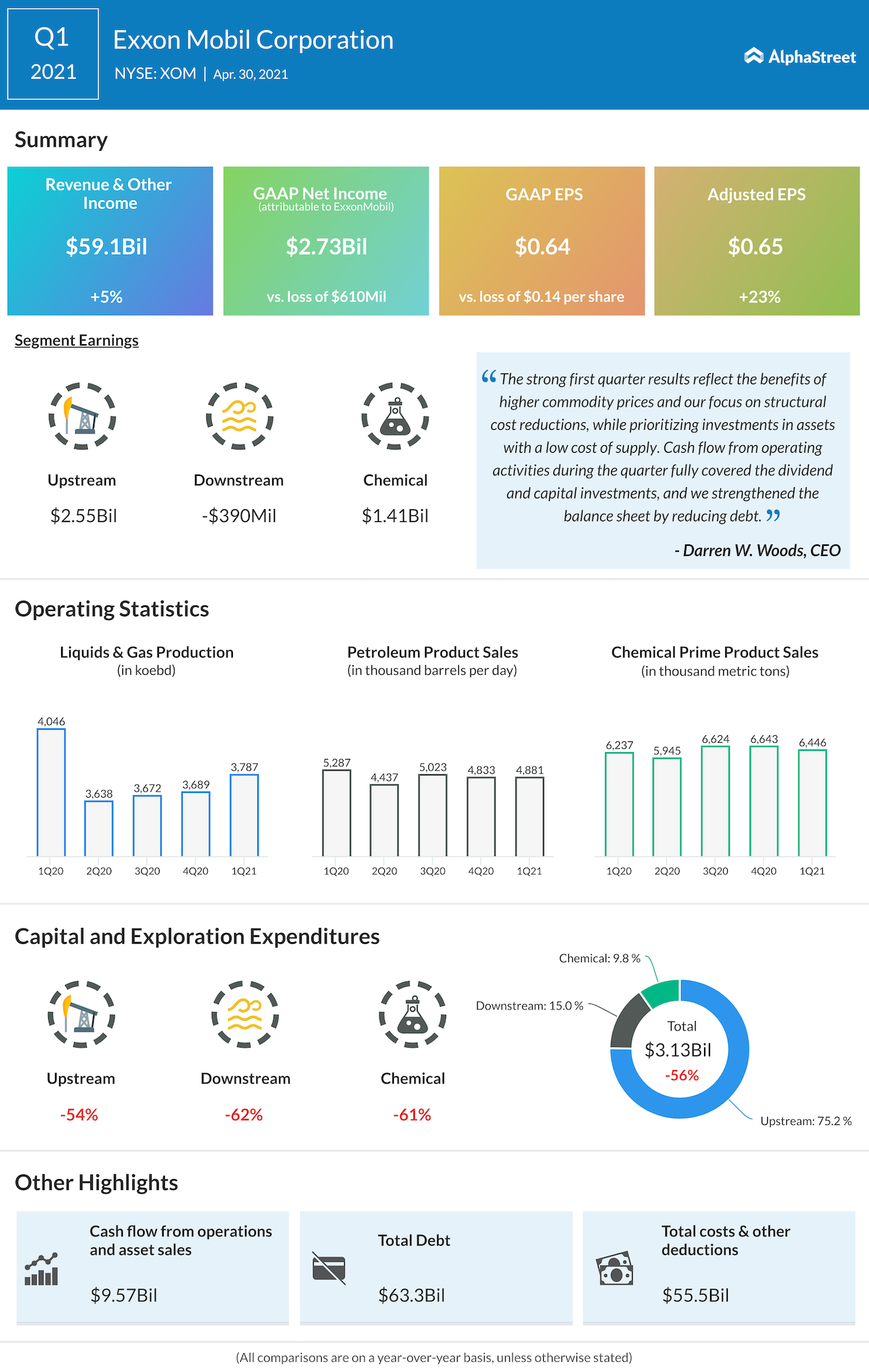 ExxonMobil Corporation (NYSE: XOM) reported first-quarter 2021 financial results ahead of the regular market hours on Friday. The oil and gas giant reported Q1 revenue of $59.1 billion, up 5% year-over-year and above the Wall Street projection. Net income of $0.65 per share was also above the target that analysts had anticipated.