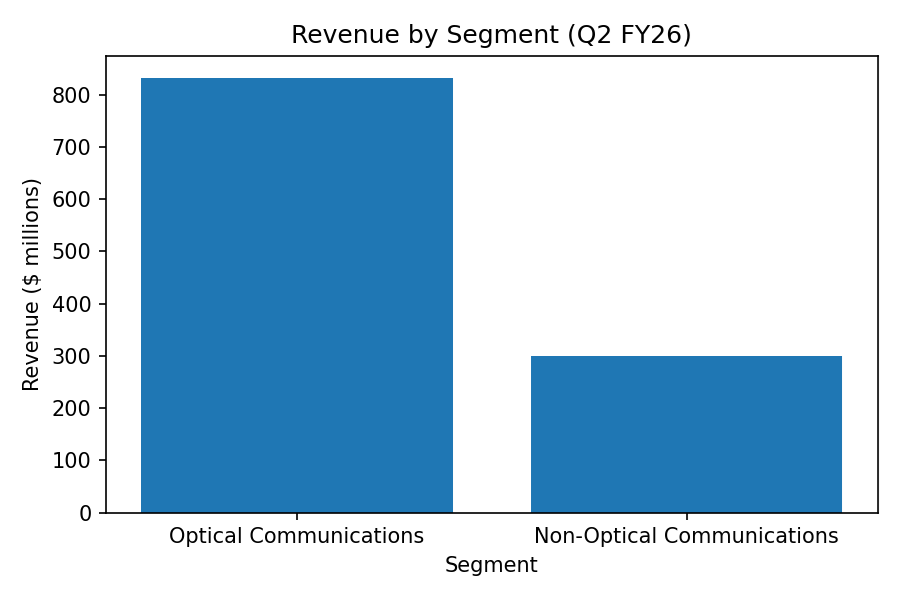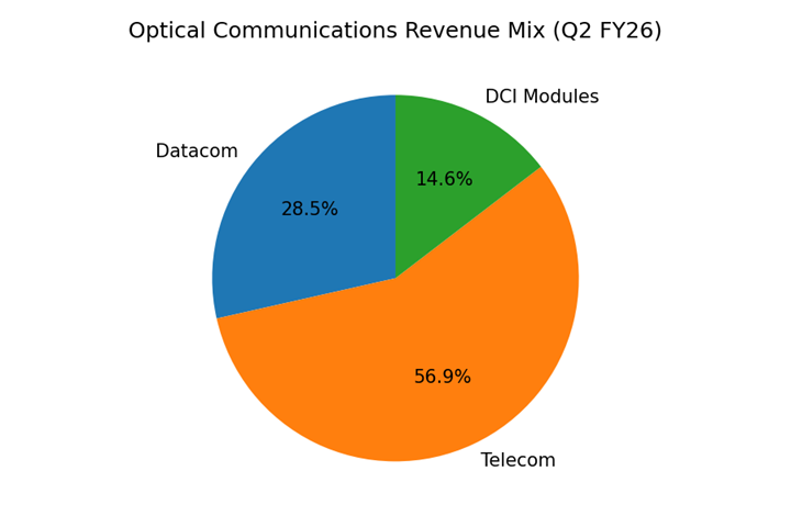 Optical communications revenue totaled $832.6 million for the quarter. Within this segment, datacom revenue was $278.1 million and telecom revenue was $554.4 million. Revenue from data center interconnect modules was reported at $142.2 million.