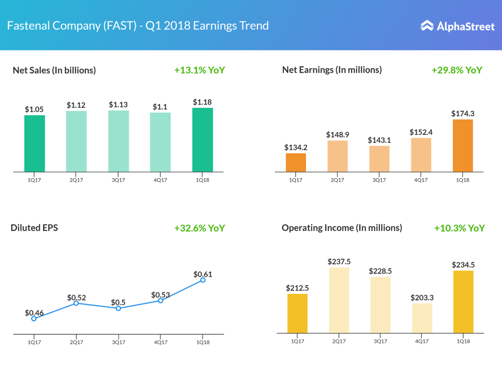 “Wholesale distributor of industrial and construction supplies Fastenal Company (FAST) reported double digit growth in its top and bottom line results, while the company missed street estimates. Net sales jumped 13.1% year-over-year to $1.18 billion, driven by higher unit sales, acquisition of Manufacturers Supply and higher prices. Profit for the quarter surged 29.8% to $174.3 […]
