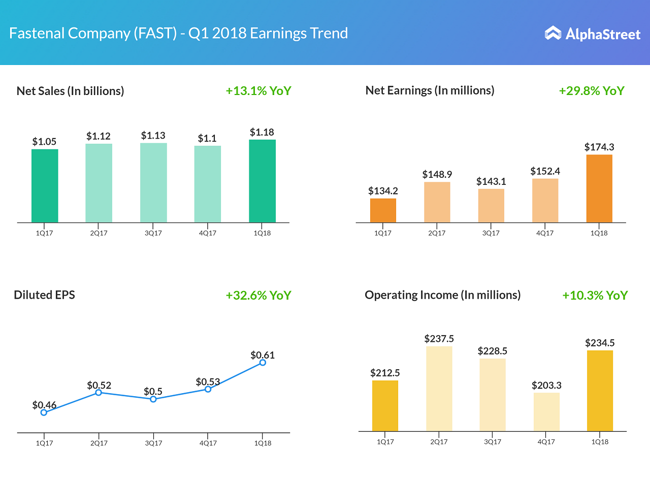 Wholesale distributor of industrial and construction supplies Fastenal Company (FAST) reported double digit growth in its top and bottom line results, while the company missed street estimates. Net sales jumped 13.1% year-over-year to $1.18 billion, driven by higher unit sales, acquisition of Manufacturers Supply and higher prices. Profit for the quarter surged 29.8% to $174.3 million or $0.61 per share. The profit increase was helped by tax benefits and higher operating income.