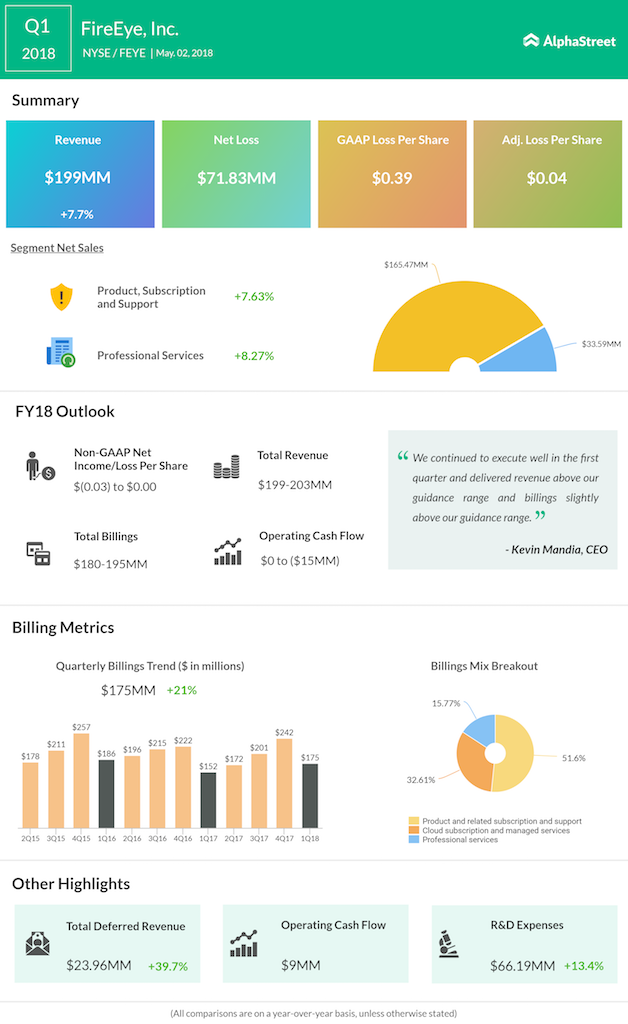 Cybersecurity company FireEye (FEYE) reported an 8% jump in first quarter revenue to $199 million, higher than the guidance range of $192 million to $197 million. The company’s billings, one of the key indicators for future growth, jumped 21% year-over-year to $175.1 million.