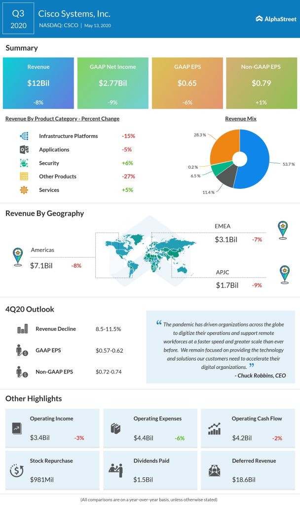 It is certain that a large number of enterprises will seek to upgrade their network infrastructure realizing its importance in the current situation, which is something Cisco can look to cash in on. Since the work-from-home concept is going to stay here in the foreseeable future, companies will ramp up their cloud capabilities and service providers would want to speed-up the deployment of 5G and Wi-Fi 6 – processes that require advanced network solutions like those offered by Cisco.