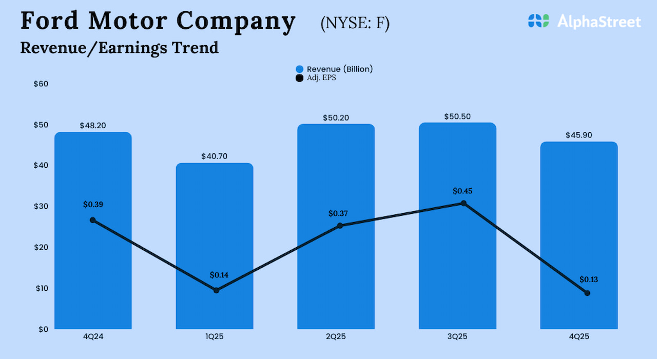 Automaker Ford Motor Company (NYSE: F) on Tuesday reported lower revenues and adjusted earnings for the fourth quarter of fiscal 2025. The bottom line fell short of expectations. The company also issued guidance for fiscal 2026.