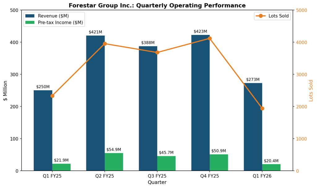 Forestar Group Inc. reported Q1 FY2026 revenue of $273.0 million (up 9% YoY) and net income of $15.4 million ($0.30 EPS). The company sold 1,944 lots at an average price of $120,700, reflecting higher-value lot mix. Book value per share increased 10% to $35.10 while net debt to capital remained conservative at 24.6%. The contracted backlog of 16,800 lots valued at $1.8 billion provides solid revenue visibility. Management maintained full-year fiscal 2026 guidance for 14,000-15,000 lots and $1.6 billion to $1.7 billion in revenue.