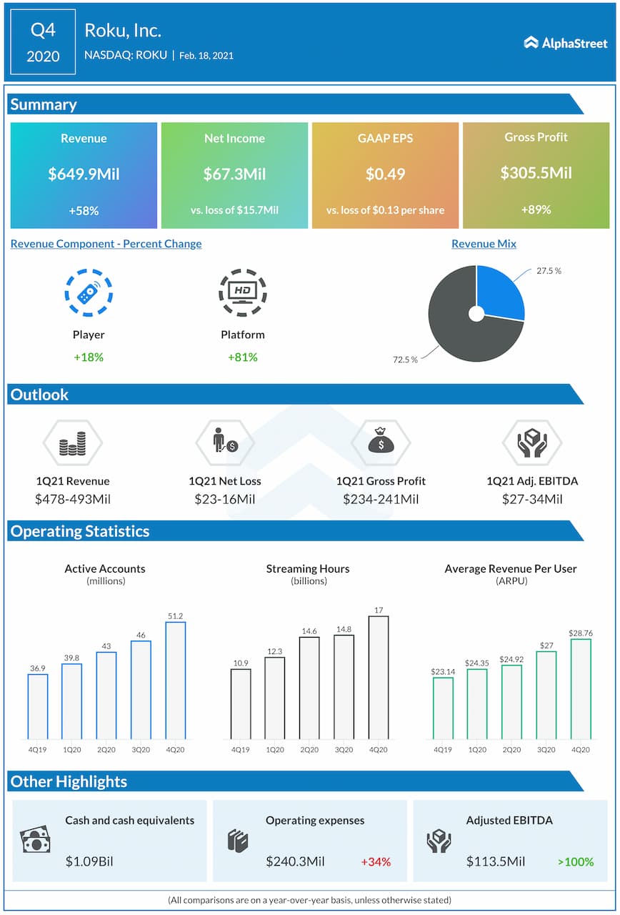 Shares of Roku Inc. (NASDAQ: ROKU) fell 1.1% in morning hours on Friday. The stock has gained 274% over the past 12 months. The company reported strong results for the fourth quarter of 2020 a day ago, exceeding expectations, and provided an upbeat outlook. Net revenue increased 58% year-over-year to $649.9 million and the company delivered a surprise profit of $0.49 per share in the quarter.