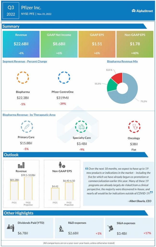 Pfizer raised its guidance for Comirnaty revenues for the full year of 2022 to approx. $34 billion, up by $2 billion compared to the previous outlook. It reaffirmed its sales guidance for Paxlovid at approx. $22 billion.